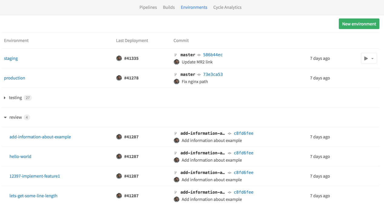 .gitlab-ci.ymlfirst. They will be automatically created for you after the first deploy.- The environments page can only be viewed by Reporters and above. For more information on the permissions, see the permissions documentation.